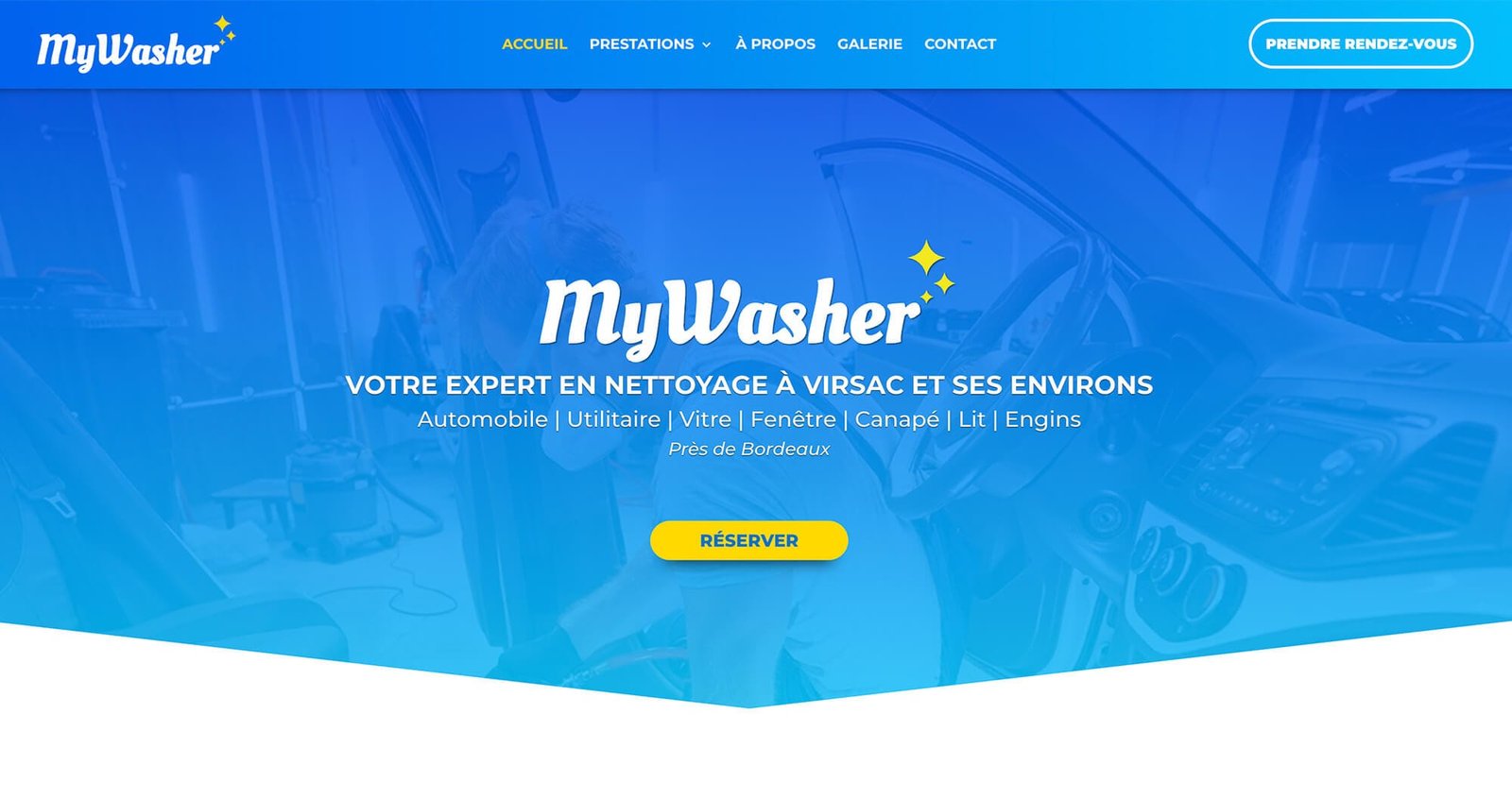 My Washer : expert local du nettoyage à Virsac (Gironde) pour voitures, utilitaires, vitres, canapés, lits et engins, avec service à domicile pour particuliers et pros.